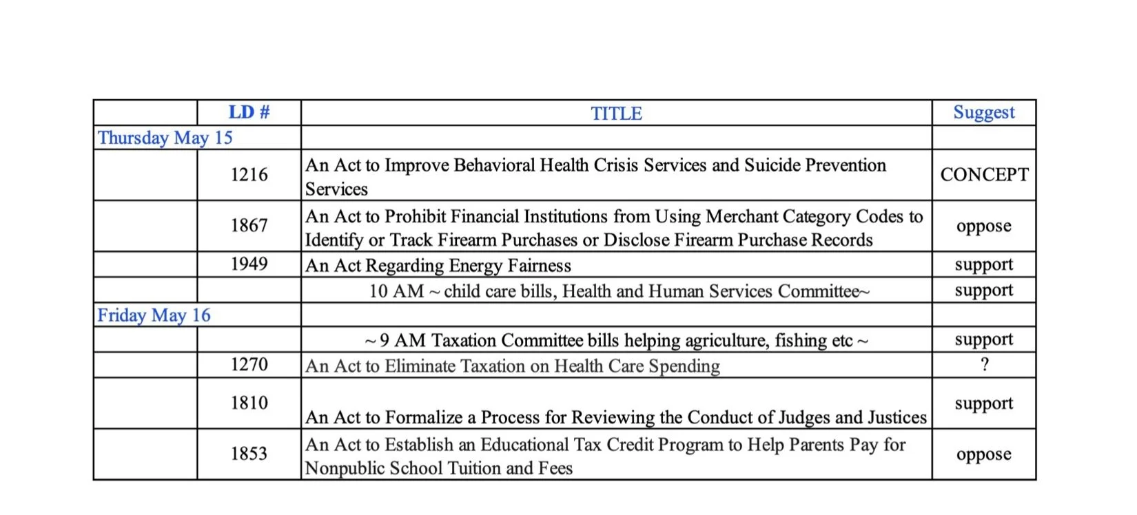 May you have a fine weekend! Then, on with the work! As usual, you can view text of any numbered bill at https://legislature.maine.gov and the whole legislative calendar at https://legislature.maine.gov/Calendar/#PHWS