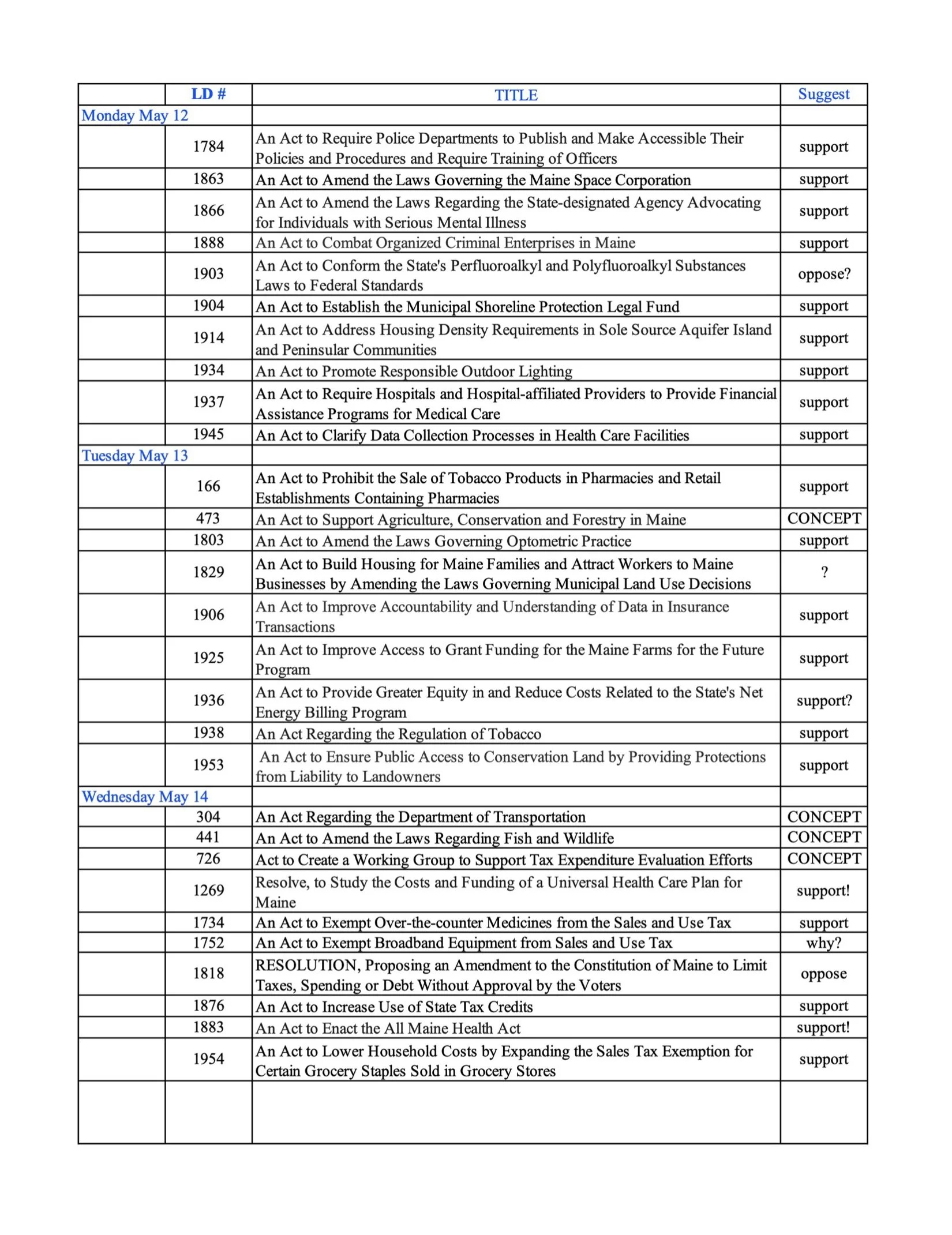 Action 110 ~ MAINE Legislation May 12-16